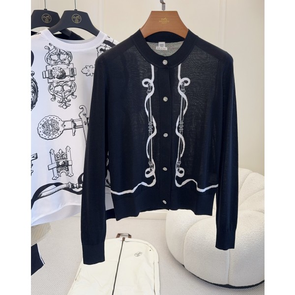 에르메스 2026 봄여름 신상 니트 가디건 블랙+화이트 라인, 심플하면서도 디테일이 있음 부드러운 니트 원단으로 착용감이 좋으며 라운드넥 + 메탈 버튼 디자인으로 입고 벗기 편함 승마에서 영감을 받은 전면 라인의 브랜드 아이덴티티 데일리 출퇴근, 캐주얼 모두 매치하기 좋으며 우아하고 실용적