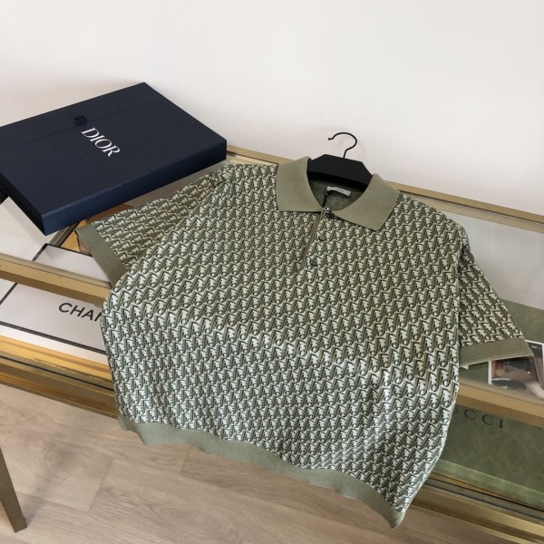Dior Oblique 프린트 폴로셔츠 화이트 블루 브라운 코튼 자카드 클래식한 Oblique 프린트로 장식된 니트 폴로 셔츠 코튼 자카드 원단으로 정교하게 제작되었으며 스트레이트 컷팅으로 단추 여밈과 골지 디테일이 세련되었음 전체 장식에 Oblique 프린트로 Dior 로고가 새겨진 진주 조개 단추 시보리 네크라인과 밑단, 소매 끝단, 면 100%